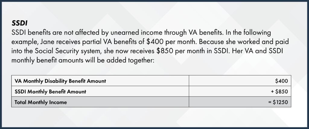Many people believe that SSDI and VA benefits reduce (offset) each other, but luckily this is not the case. These programs are designed to complement each other, allowing you to receive the full amount from both with no offsets.